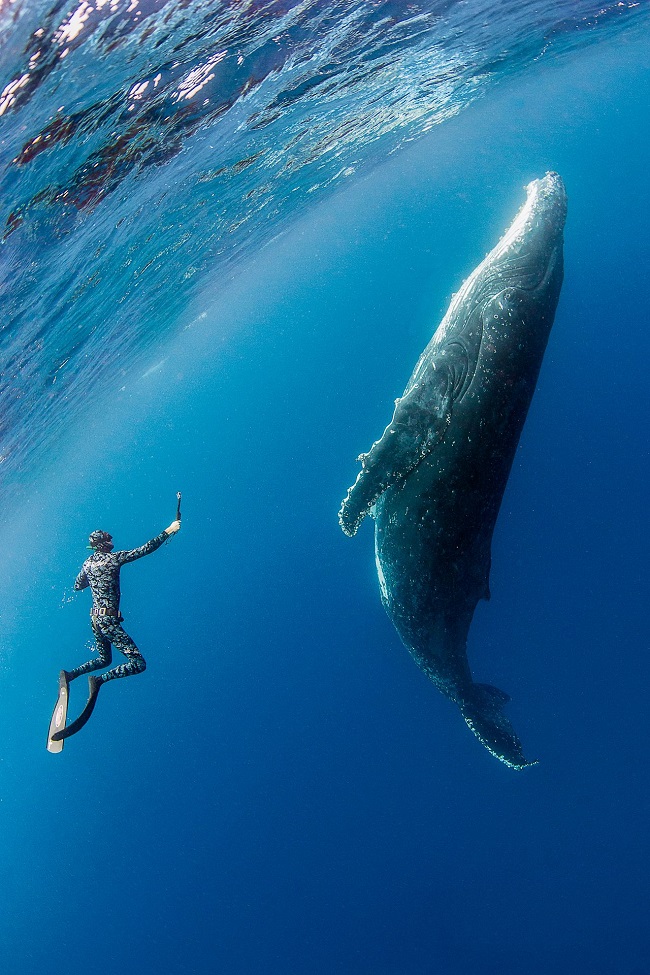 This is one incredible photograph with the first swim along with an ever obliging and interactive humpback whale. This is an adventure of a lifetime where the subject is dancing with whales.